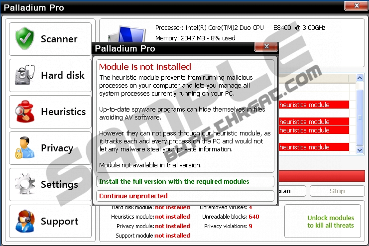 Palladium ProThere are many reasons as to the continued success experienced by developers of rogue antispyware applications, as in the case of Palladium Pro. One main reason why these rogues – and Palladium Pro in particular – manage to rip so many people off is the sophistication which goes into the design and distributing of these harmful rogue applications. Palladium Pro hails from the same destructive family of rogues as the Fake Microsoft Security Essentials does. Palladium Pro is delivered to the host PC through various forms of transmission. Palladium Pro certainly does not break new ground with its infection patterns, and makes use of established means of infection. Making use of seditious Trojan and malware infections to surreptitiously enter the prospective victim’s PC, the PC owner will remain unaware of the presence of Palladium Pro on his system until the rogue reveals itself to the user. Browser hijackers are also a popular means of infection for Palladium Pro which enters the system forcefully through these illicit domains which make use of sneaky drive-by download techniques. After the Palladium Pro infection roots itself in the system, the PC owner will start receiving various pop up messages from the Fake Microsoft Security Essentials rogue, stating that his system is infected with severe viruses. This is done in part to further cement Palladium Pro’s legitimacy with its intended victim, but more so to create panic in the PC owner. These fake alerts will report that the system is infected with: “Trojan.Horse.Win32.PAV.64.a” These fake alerts read as follows: “Microsoft Security Essentials Alert “Microsoft Security Essentials Alert Obviously these fake security notifications simply cannot be trusted. Users are urged not to react to the calls of action contained in the fake alerts, as Palladium Pro is completely dependent on user interaction in order to successfully complete its dubious goal. If the PC owner reacts to the fake alerts and install Palladium Pro, the rogue will reboot the system to complete the installation. Once the system boots up, the user will be presented with the Palladium Pro start screen instead of the expected Windows Desktop. Palladium Pro will then demand that the PC owner scan his system, and will generate a list of falsely reported threats on the system. At this stage, Palladium Pro will not allow the PC owner to use his system as normal, until he pays for the Palladium Pro software. Users will be denied access to their Desktops, and won’t be able to successfully launch Task Manager either. If the user tries to close Palladium Pro, he will receive the following message: "Current settings don't allow unprotected startup. Please check your settings." Should you wish to attempt a manual removal, the Palladium.exe and, z.exe processes should be terminated. To locate the Palladium Antivirus files on your PC, open Windows Exporer, type %AppData% and search for and delete Palladim.exe and z.exe from the PC. If you find your Internet connection blocked by Palladium Pro, simply enter the following security key to restore Internet connectivity: 5E2121EE-0300-11D4-8D3B-444553540000 Palladium Pro is a scam which ransom its victims’ PCs until they pay the extortion fee. Do not fall victim to this incredulous rogue. Rather destroy Palladium Pro from the system before it causes irreversible damage. Make the best use of a powerful security application which will not only get rid of Palladium Pro but also protect against future similar attacks. You don't have any other choice than to delete Palladium Pro from your system completely. Follow these 6 easy steps to completely get rid of Palladium Pro and get control over your desktop 1. You will not be able to access your Desktop. After the system boots up, you will arrive at the Palladium Pro Start Screen. Click on "Safe startup" button. 2. Wait till Palladium Pro loads and starts scan. 3. Wait until Palladium Pro ends scan and click on "Unlock modules to kill all treats" button at the bottom right. 4. When you click on "Unlock modules to kill all treats" Palladium pro will show you a purchase page. DO not Enter any credit cards number there! All you need to do is close it like we show in a picture below: 5. After you have done step 4 now you will be able to close Palladium pro window. 6. Your desktop will be restored and you will be able to successfully use your computer to remove Palladium pro. | ||||||||