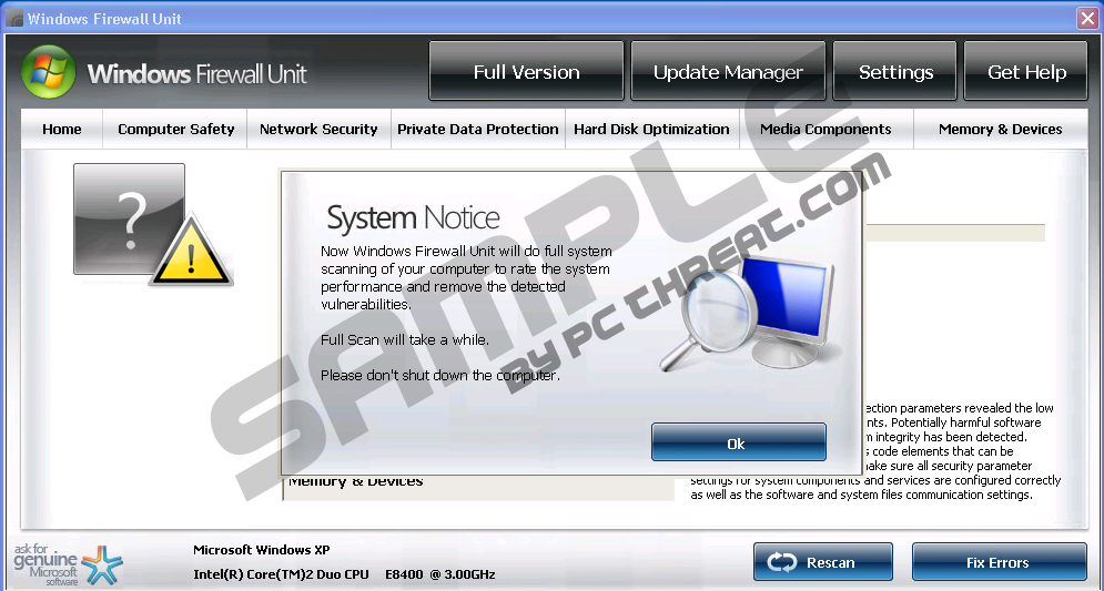 Windows Firewall Unit makes use of various established forms of infection. These include using browser hijacking websites which forcefully redirect users to their compromised landing pages, and then use drive-by download tactics to drop the Windows Firewall Unit infection into the system. Other tactics include Windows Firewall Unit using bogus online malware scanners, as well as flash ads. Because of its stealth infiltration of the system, the user will find it difficult to identify and remove Windows Firewall Unit from the system without some help. In fact, the rogue will hide its presence from the user until such time that it is ready to start its attack against the system. This will usually be heralded by Windows Firewall Unit initiating a fake system scan. Once the rogue securely roots itself in the system, it will also edit registry entries to ensure it is executed each time Windows runs. The fake system scan will result in various false positives, warning the user on supposed severe threats such as Unknown Win32/Trojan and Backdoor.Win32.Rbot crippling his system. These are of course fake reports, and should be disregarded. As a further attack on the system, Windows Firewall Unit will spam the user with various incessant fake security messages. These pop ups will harass the user until he either decides to get rid of Windows Firewall Unit or pay for it. Other symptoms include poor system performance, the inability to establish an Internet connection, block on running applications and increased erratic system behavior. Some of the more popular fake alerts to be on the lookout for reads as follows: System Security Warning Warning! At the end of the day the only way you will be able to restore your system’s security and take back control of your PC will be to utterly erase Windows Firewall Unit forever. This can safest be achieved by making use of a genuine and powerful security tool, which will eliminate Windows Firewall Unit but also protect against similar incurring infections in future. | ||||||||