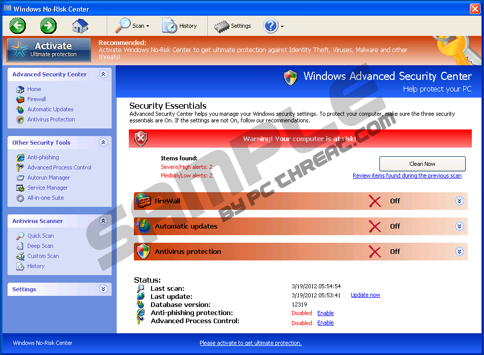 Windows No-Risk CenterNo matter how hard the computer security specialists try to tackle down the distribution of rogue antispyware, such applications as Windows No-Risk Center still infect thousands of users around the globe. True to its nature, Windows No-Risk Center poses as a reliable computer program that can protect you from various threats. Unfortunately, it is a dangerous threat itself, and before your computer gets damaged beyond repair, you need to get rid of Windows No-Risk Center. This rogue can find its way to your system via fake online malware scanners, hacked websites, social engineering and other ways of distribution. You have to be especially careful when you receive messages on social websites from people you don’t know, asking you to follow the link they have posted. That link usually contains the infection that automatically installs Windows No-Risk Center and then you have to brace yourself against the wearisome battle with the rogue. You might want to consider changing your password on the social website as well. When you deal with Windows No-Risk Center, do not pay attention to the scan results and the fake security notifications received from this rogue. Everything is a downright lie and you must remove Windows No-Risk Center before it swindled you out of your money and crippled your system. Consider investing in a legitimate computer safeguard tool to protect your system against similar attacks in the future. Do all it takes to get rid of Windows No-Risk Center. UPDATEWindows No-Risk Center certainly is not a newbie in the field. You have to understand how important it is to remove the rogue, because Windows No-Risk Center is a direct clone of Windows Antihazard Solution, Windows Managing System, Windows Risk Minimizer and other dangerous computer threats from the Rogue.Virus Doctor family. Sometimes it might be hard to even think about deleting it, keeping in mind the galore of fake security notifications the rogue bombards you with. Then you should use the following activation key: 0W000-000B0-00T00-E0020 Click the "Activate Ultimate Protection" button at the top-left corner and enter the code into the registration window. Windows No-Risk Center will be overridden, and you will no longer see these fake messages invade your screen: Warning! Identity theft attempt Detected Warning Error Your Windows Task Manager and Registry Editor should also work again, since Windows No-Risk Center is known to block these two utilities in order to avoid removal. However, using the activation key does not mean that Windows No-Risk Center is gone. The rogue is only sedated for a time being, and you need to terminate it for good in order to avoid further complications. If you have no idea how to remove Windows No-Risk Center on your own, feel free to invest in a reliable antimalware product that will delete the rogue and all of its components in no time. Do all it takes to protect your computer from similar threats.