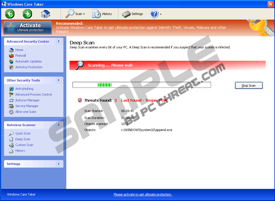 Windows Care TakerWindows Care Taker is nothing but a scam so you should not get hooked on this fraudulent program which seeks to steal your money. You can claim that this fake application protects your system very carefully; however, Windows Care Taker only makes you believe that it does it that way. Windows Care Taker might get on your computer via Trojans which might be caught when opening a suspicious email attachment, running simulated online scan or performing other action on the Internet. Once the rogue is in the system, it will modify the registry so that the malware starts running when you log on to Windows. Moreover, Windows Care Taker will continually pop up fake messages claiming that your system is infected with simulated viruses, which might be harmless files after all. The simulated scan results might leave you in a state of uncertainty about further actions. In such a case, the only possible action is to remove this obnoxious and fabricated malware from the system. It is up to you how you choose to delete Windows Care Taker. The fact is that it must be removed from the system if you do not want to expose your financial data while paying the criminals for this fake application. Let a legitimate application scan your system, which is strongly recommended, and get rid of Windows Care Taker. You could also refer to the manual removal guidance to get rid of this malware. UDPATEIf you are dealing with Windows Care Taker, you might want to jot this code down: 0W000-000B0-00T00-E0020 This activation key is there to help you with the Windows Care Taker's removal. Click the "Activate Ultimate Protection" button on the rogue's interface and enter the key into the rogue's registration box. It will only be in effect for a few minutes, but even these few minutes are gold when you are dealing with Windows Care Taker. The reason why it is the best to register Windows Care Taker before removing it, is that this rogue shares its capabilities with other versions of the same infection - Windows Custodian Utility, Windows Shielding Utility, Windows Warding System and others. Just like its predecessors Windows Care Taker blocks your Registry Editor and Windows Task Manager to prevent you from removing the rogue on your own. Then it denies you the Internet access, thus successfully cutting you off from the means of automatic rogue removal as well. Naturally, Windows Care Taker makes it seem as though all of this erratic behavior is caused other "viruses" and so it lets you know about them in the form of false security notices: Error Warning Warning! Identity theft attempt Detected All of that is absolute rubbish, and you need to ignore these messages point blank. Once you register Windows Care Taker with the code provided above, do not waste any second and find a computer safety application that will help you to remove Windows Care Taker for good. Keep in mind, that the longer you allow this rogue to remain your computer, the more damage your system receives.