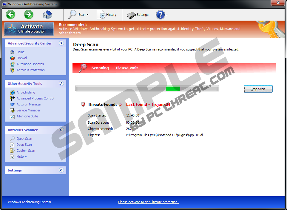 Windows Antibreaking SystemThere are applications which are reliable and valuable and if you are considering whether Windows Antibreaking System is one of them, think again because it is worth deleting it from the system. Remove Windows Antibreaking System at once when you find it attacking you with fake notification saying that you should buy a fake full version to delete those threats. This malware was designed to trick you into believing that paying money for it is the only way to fix the problem. The problem of Windows Antibreaking System arises when you perform careless actions on the Internet. For example, you might infect your system with a Trojan through a fake online scan. You may also download a fake video codec or open / click on a suspicious link or attachment etc. Therefore, the Trojan installs Windows Antibreaking System and the “party” gets started. Windows Antibreaking System displays a lot of fake alert pop-ups and annoying proposals for purchase of the malware. Moreover, it runs quick scans which ends with imaginary threats which might not exist in reality as such. Do not wait until you lose your mind and remove Windows Antibreaking System if you want to safe your money and sanity. Removal of Windows Antibreaking System is a cumbersome operation and you have two options for deleting the malware from the system. The first option (the tricky one) is a manual deletion of the rogue which means that a complete disposal is done when all components of the infection are removed from the system. It might be difficult for inexperienced user to search those Windows Antibreaking System’s components out, thus our suggestion here is to use a legitimate antispyware tool which would delete Windows Antibreaking System from the system and there would be no worry to damage the system while cleaning the computer manually. UPDATEIt does not require an expert to see that Windows Antibreaking System is just another version of other rogues from the group called Rogue.VirusDoctor. We have already encounters numbers of other rogues that look exactly the same and the only difference is in the name - they were called Windows Processes Accelerator, Windows Efficiency Reservoir, Windows Care Taker, and now we have Windows Antibreaking System. The most important thing about this infection is to avoid giving away your financial information. No matter how desperate the situation might seem, you simply cannot purchase the full version of Windows Antibreaking System, because then you would be giving away a key to your bank account to the cyber criminals who have created this infection. Rather than doing what Windows Antibreaking System wants you to, you might want to try out using this: Registration code: 0W000-000B0-00T00-E0020 This code cracks the defense of Windows Antibreaking System and makes the rogue behave as if you have really paid for it. That is to say, the rogue declares that it has removed the "viruses" that have been detected on your computer, and all the annoying infection symptoms disappear. It means that you can have Registry Editor, Windows Task Manager AND the Internet connection back. Also, these fake security notifications no longer pop up in your window: Error Warning! Identity theft attempt Detected Warning However, registering the rogue does not mean it disappears from your system for good. Windows Antibreaking System is still there and you need to take care of that. If manual removal is too much of a challenge for you, invest in a trustworthy computer security program that will erase Windows Antibreaking System for you in no time. You will also protect your computer against other threats, so do not wait any longer and do what's right.