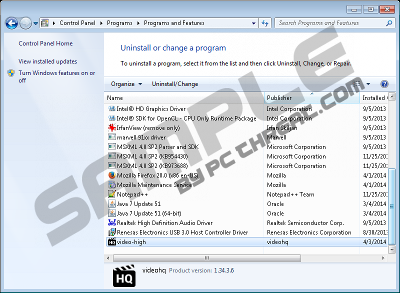 I have tried repeatedly to uninstall video-high software that my nephew accidentally installed on his computer. Nothing I do will remove this software. My antivirus catches it but can not quarantine the program. Any help would be welcome.
