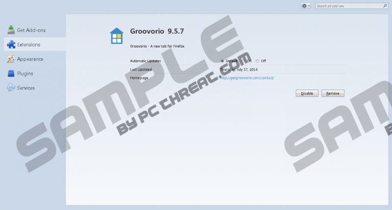 Groovorio.comGroovorio.com is a search engine which is set as your default search provider and home page if you pay no attention to the installation process of a program called Groovorio. The program is a browser add-on, and it is compatible with Internet Explorer, Google Chrome, and Mozilla Firefox. The Groovorio program is promoted at getgroovorio.com; however, the website contains no download button. The browser plug-in is available on Chrome Web Store and may be bundled with other free programs. The Groovorio program is aimed at helping you access your favorite websites in no time. It enables you to customize your new browser tabs by filling them with links to various websites, including Facebook, YouTube, Twitter, Booking.com, Amazon, eBay, and many other websites. The program is maintained by IronSource Ltd, which collects some non-personally identifiable information, such as your IP address, search query terms, browsing history, the URLs of the websites you access, and some other details. According to the privacy policy of the program distributing the search engine groovorio.com, the program does not collect personal information such as name, address, and phone number. The Groovorio adware program may also provide you with third-party advertisements, which you should ignore if you want to avoid unreliable websites. We recommend that you ignore those ads because IronSource is not liable for third-parties; the company has no control over the activities of the sponsors of the program, which means that you interact with Groovorio advertisements at your own risk. Groovorio.com is known to use the advertisement hosting server adclick.g.doubleclick.net, which is commonly used by other search engine and adware programs. As regards the search engine Groovorio.com, it is important to note that the changes within your browsers can be prevented. If you do no deselect three check boxes, get ready for various advertisements and sponsored links. The startup page of the search engine displays advertisements that have nothing to do with your earlier search terms and present browsing interests. In order to get rid of all those advertisements and sponsored links displayed on the search engine results page, remove Groovorio.com from the computer and make sure that the operating system is properly protected against malware and spyware. We recommend that you remove Groovorio.com from the computer using a powerful spyware removal tool because after uninstalling the Groovorio adware, no changes are made within your browsers, and you have to restore your former settings manually. Below you will find our step-by-step instructions on how to remove Groovorio.com, but we advise you to implement SpyHunter. In case you are determined to remove Groovorio.com manually, scan the computer after removing the program to make sure that all the components of the adware program are deleted. How to remove Groovorio.comWindows Vista and Windows 7