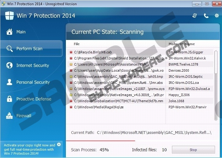 Win 7 Protection 2014Do you think that Win 7 Protection 2014 is a reliable program which will ensure that all dangerous threats running on the PC are deleted? If this is what you believe, we should discuss the programs that are active. First of all, the supposedly dangerous threats listed by the associated scanner are bogus, and you do not need to worry about their removal. Secondly, the allegedly reliable security tool is a threat itself, and you need to delete it as soon as possible. Finally, the infection often runs alongside Trojans and other devious infections, all of which you must get rid of as well. The report reviews the removal of Win 7 Protection 2014 and the related computer threats. Win 7 Protection 2014 comes from a faction of rogue anti-spyware tools known by the names FakeRean, Multirogue or Braviax. These infections are dangerous to specific operating systems, which is why it is likely that the owners of different Windows versions will need to delete XP Protection 2014, Vista Protection 2014 and Win 8 Protection 2014. These infections are equally as misleading, and they look practically identical. If the clandestine rogue enters the system, it blocks the running of executable files, so that you could not delete Win 7 Protection 2014 on your own or install real, authentic malware removal software. Unfortunately, the rogue manages to conceal this malicious activity by putting the blame on the allegedly running Trojans, worms, keyloggers, and other intimidating infections. Keep in mind that the information presented via the rogue’s interface and the bogus pop-up warnings (see below) cannot be trusted.