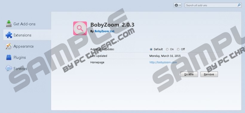 BobyZoomBobyZoom is an application that will allow you to zoom on any picture you find while browsing the Internet. It might seem to be a really useful program at first sight because it promises to enable users to magnify pictures in just one click; however, we still do not think that it can be trusted 100%, so we think that you should remove BobyZoom as soon as possible. There is no point in keeping advertising-supported applications on your system because they might expose you to threats, disrupt your browsing session, and even violate your privacy. We do not think that you want this to happen, so we expect that you will remove BobyZoom very quickly. In order to help you delete this adware program, we have prepared the removal instructions, which you will find below this article. As has been mentioned, BobyZoom is a typical advertising-supported application, which means that it is going to display advertisements. According to the researchers working at pcthreat.com, you might see various pop-ups, coupons, price comparison ads, and in-text ads on your screen. Advertisements tend to promote various products and services; however, we do not recommend clicking on any of them because you might be redirected to untrustworthy websites and you might even unknowingly download unreliable applications on your PC. We do not think that you want to cause harm to your computer. If this is true, you should remove BobyZoom from your system as quickly as possible. BobyZoom will not only display ads that might take you to third-party websites, but it might also collect information about your online habits. Luckily, this program does not collect personal information; however, it is known that it is interested in the websites you visit, the content you access, the search queries you enter into the search box, and other similar information. It gathers this data in order to show you relevant ads. In other words, BobyZoom wants to lure computer users into clicking on those ads. We do not think that you should keep untrustworthy applications on your system, so we suggest that you remove BobyZoom as soon as possible. It is not very difficult to do, but we have still prepared the manual removal instructions for you. Follow them step by step to remove BobyZoom fully. You should know that it is also possible to delete this program automatically. You simply have to scan your computer with an antimalware tool such as SpyHunter. It will remove all the existing infections and protect your PC from other threats, so we think that it is worth investing in. Remove BobyZoom from your computerWindows XP
