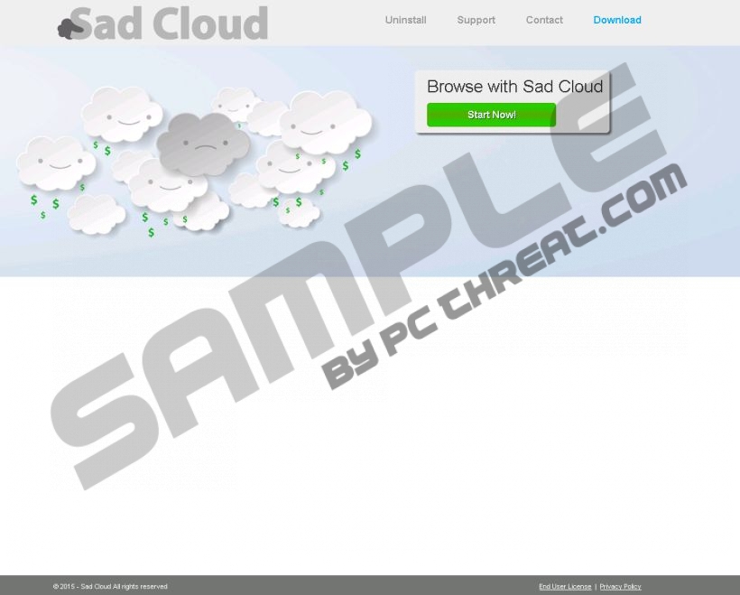 Sad CloudIt is rather peculiar why one would name a program Sad Cloud when the application is supposed to help users save money on their online purchases. After all, would you want to install a program called Sad Cloud? On the other hand, if this application is already running on your system, we strongly recommend that you remove Sad Cloud from your computer, as this application is nothing but an adware program, designed to promote third-party content. The people behind this app earn money as you get redirected to unfamiliar websites. Sad Cloud gives you nothing in return, so there is no need to keep this application. Once Sad Cloud manages to enter a target system, it adds an extension to your default browser. Take note that the application does not function on Google Chrome, although the information at sadcloudplace.com says that the application is compatible with all the major web browsers. Our research shows that the newer Google Chrome versions simply block Sad Cloud because the application is not considered safe enough. We can see why it would be thought to be a potential computer security threat. Sad Cloud promotes third-party content that it does not review, so if malevolent third parties decide to make use of this application to distribute their content, sooner rather than later you could get infected with malware. All by itself Sad Cloud is not a malicious infection. This adware application belongs to the SuperWeb family of adware applications (just like Simple for You, Dollar Dream, Wooden Seal, etc.), and the main reason it enters your computer is money. Sad Cloud does not try to steal your savings directly. It simply displays commercial ads when you browse the Internet, and if you click any of the Sad Cloud ads, you get redirected to third-party sites related to online marketing scams and other suspicious activities. At the same time, each time you click an ad, the people behind Sad Cloud get paid through the Pay-per-Click system. Sad Cloud does not employ any illegal measures to help its creators generate financial profit, but the application has a very loose privacy policy that could lead to particular security issues. If you care about your computer’s safety, you will remove Sad Cloud at once. Manual removal is not complicated because you can uninstall Sad Cloud via Control Panel. However, do not forget that Sad Cloud might have entered your computer bundled with other freeware apps, and they should not be left to their own devices. Unnecessary applications clutter your system and expose you to potential security threats. Thus, the sooner you delete all the unwanted applications, the better. How to Remove Sad CloudWindows 8 & Windows 8.1