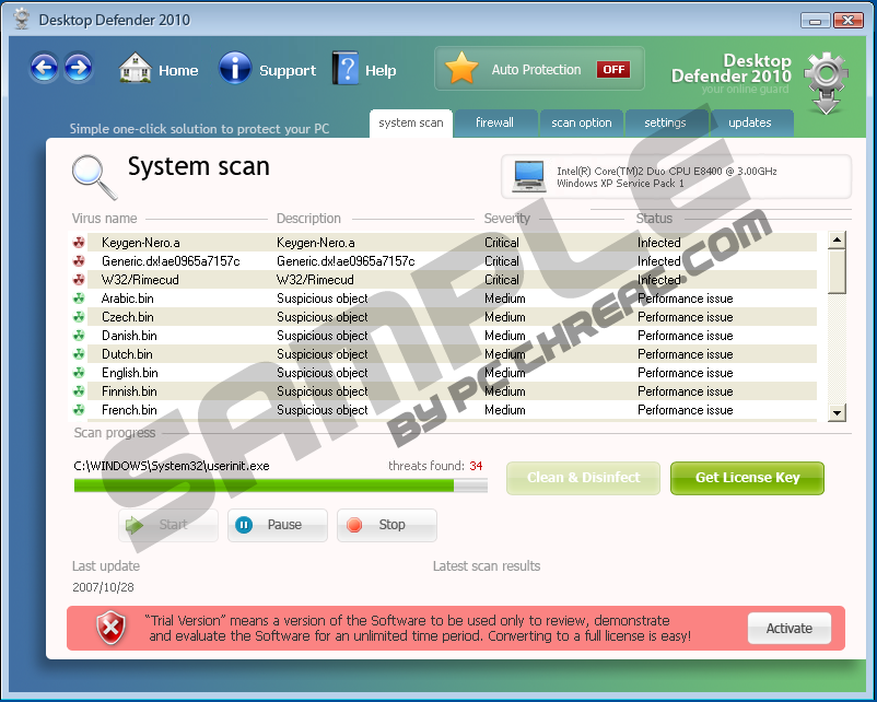 Desktop Defender 2010Desktop Defender 2010 is the latest in fake security tools, disguised as a legitimate antispyware application, this dubious applciait0on will only cause damage to any system it has infiltrated. Desktop Defender 2010 hails from the same rogueware family as Contraviro and UnVirex. Desktop Defender 2010 is sneaky, and may hide itself within registry files on an infected system; therefore there are a few sure ways to tell whether your system may be in jeopardy of infection. In order to protect your system against the threat of Desktop Defender 2010, there are 4 main rules you should always adhere to: • Rule 1: • Rule 2: • Rule 3: • Rule 4: One will need to remove Desktop Defender 2010 from the infected computer system, as soon as it has been detected. The thing about Desktop Defender 2010, and many rogue anti-virus applications, is that fact that it is extremely difficult to delete from an infected system. All in all though, I would recommend that one should make use of a reliable and legitimate, fully functional, up-to-date anti-spyware application, to remove Desktop Defender 2010 and all its components from the infected computer system. | ||||||||